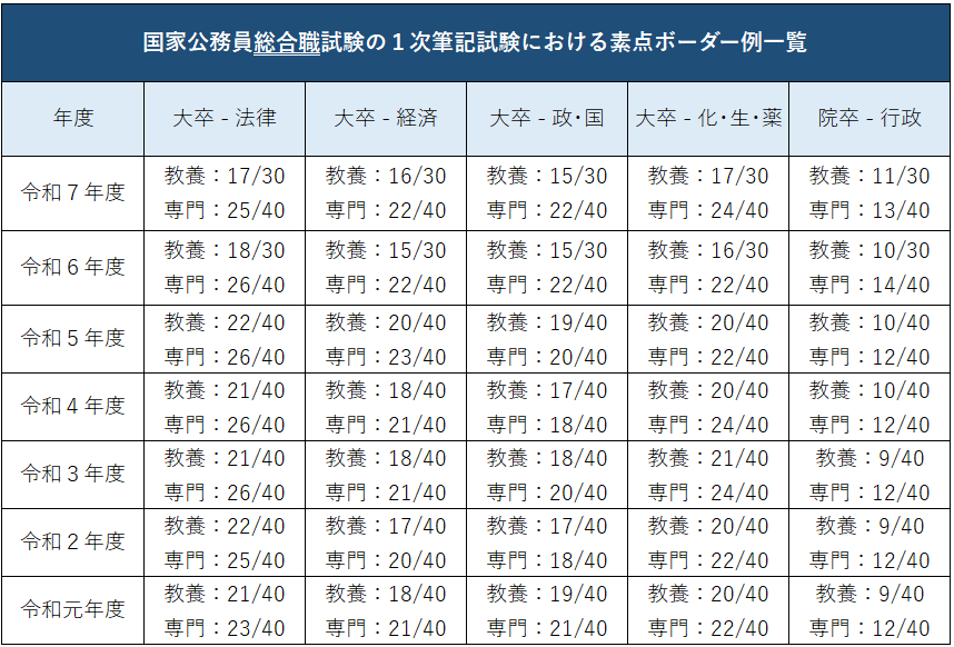 国家専門職試験の1次筆記試験における、近年のボーダーは次のとおりです。