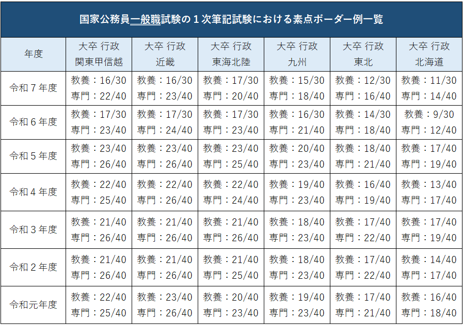 - 国家一般職試験行政区分では、「近畿、関東甲信越、東海北陸」の区分においてボーダーが高い。