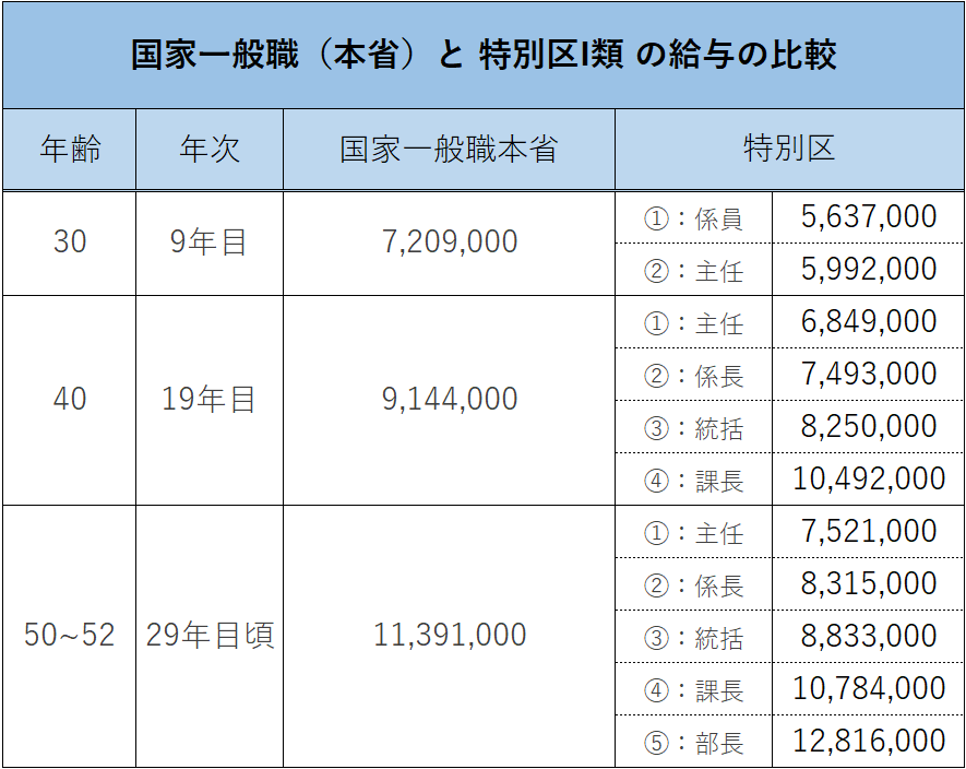 - 特別区の中で早期に課長級、部長級に昇格した人の場合は、本省国家一般職を上回るため、現実的な最高到達点は特別区の方が高いといえる。