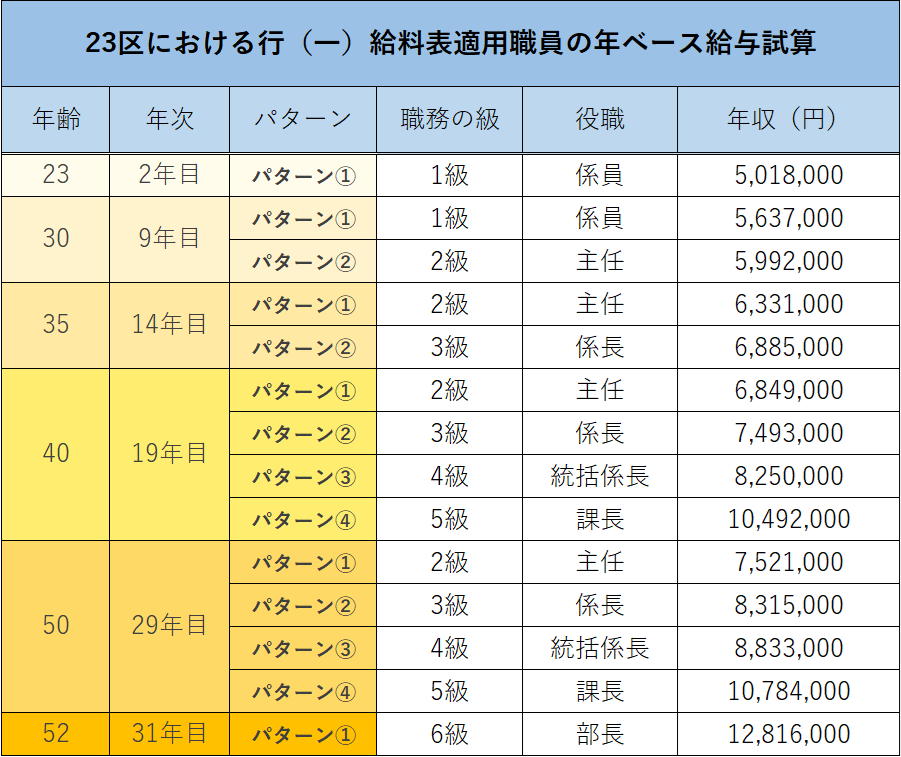 いかがでしょうか。平均的には、職員の平均年齢40歳過ぎの時点で700~1000万円程度というのが一つの目安として言えます。特別区では、制度上は最速で40歳手前で課長級になることができますが、課長級であれば1000万円以上、さらに50歳くらいで部長級に上がると1,300万円程度になるようです。